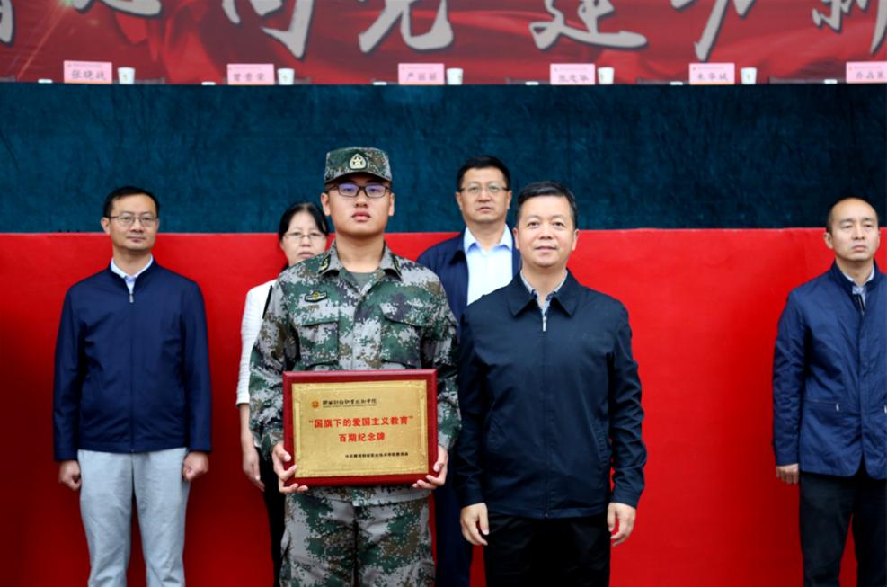 党委副书记朱华斌为国护队颁发了第100期“国旗下的爱国主义教育”纪念牌。我院自2017年开始坚持每周一早七点举行“国旗下的爱国主义教育”升旗仪式,国旗护卫队的同学们风雨无阻,用青年该有的担当出色的完成升旗任务,让全院学生通过仪式教育厚植家国情怀。