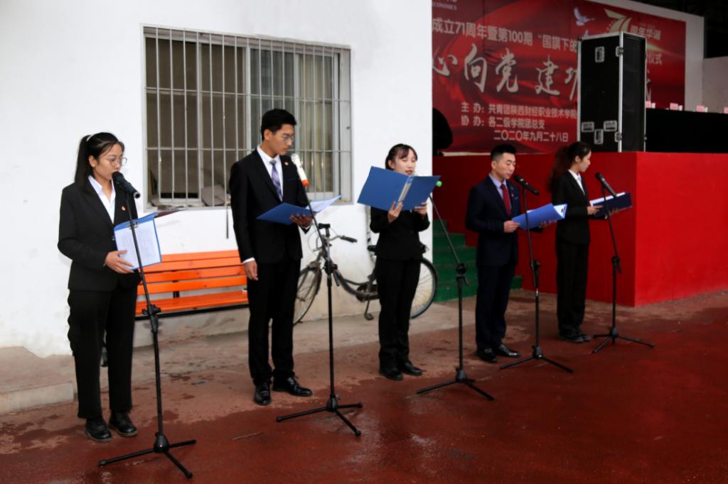 张星雨等5名同学代表全院学生作国旗下的演讲,他们以《祖国母亲,我们已经长大》为题表达了青年学生深厚的爱国主义情怀。他们表示:90、00后一定会艰苦奋斗、刻苦学习,肩负起中华民族伟大复兴的历史重任。